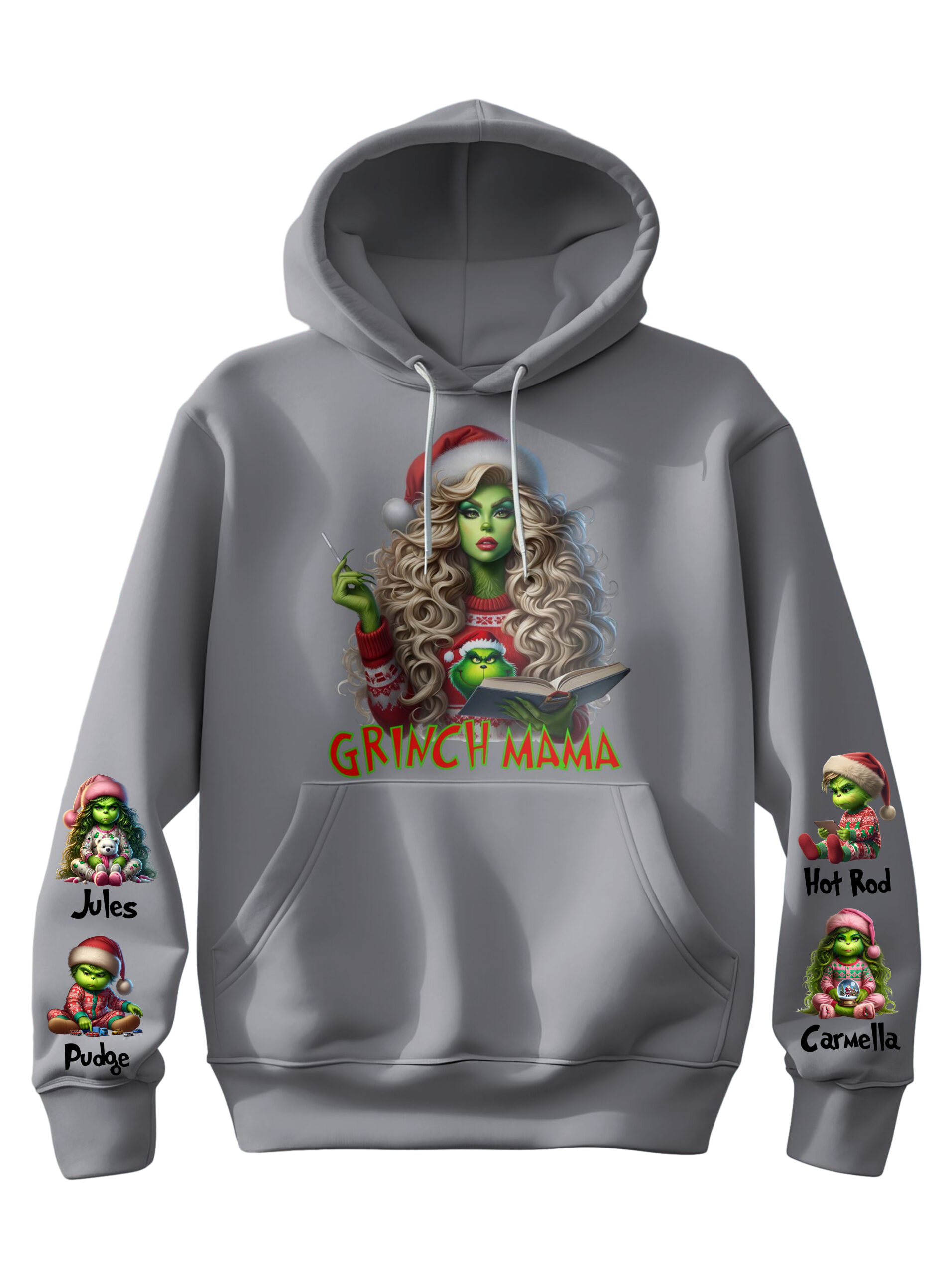 Each custom Grinch Mama hoodie has 10 “Mama” characters to chose from, and 14 child images to choose from. You can tell us what you want to be called. For example; you can be Mama, Mom, Gigi, Nana, Granny, MeeMaw, or any other title you choose. However, please keep in mind that should you choose a title that has a lot of letters, it will be necessary for us to decrease the font size, as we can only get a certain number of letters across the print surface with the default size. The same is true for the kids, grandkids, nieces, or nephews. Whether you give us their names or nicknames, once the name reaches a certain number of characters, we have to shrink the font size to accommodate the additional letters.