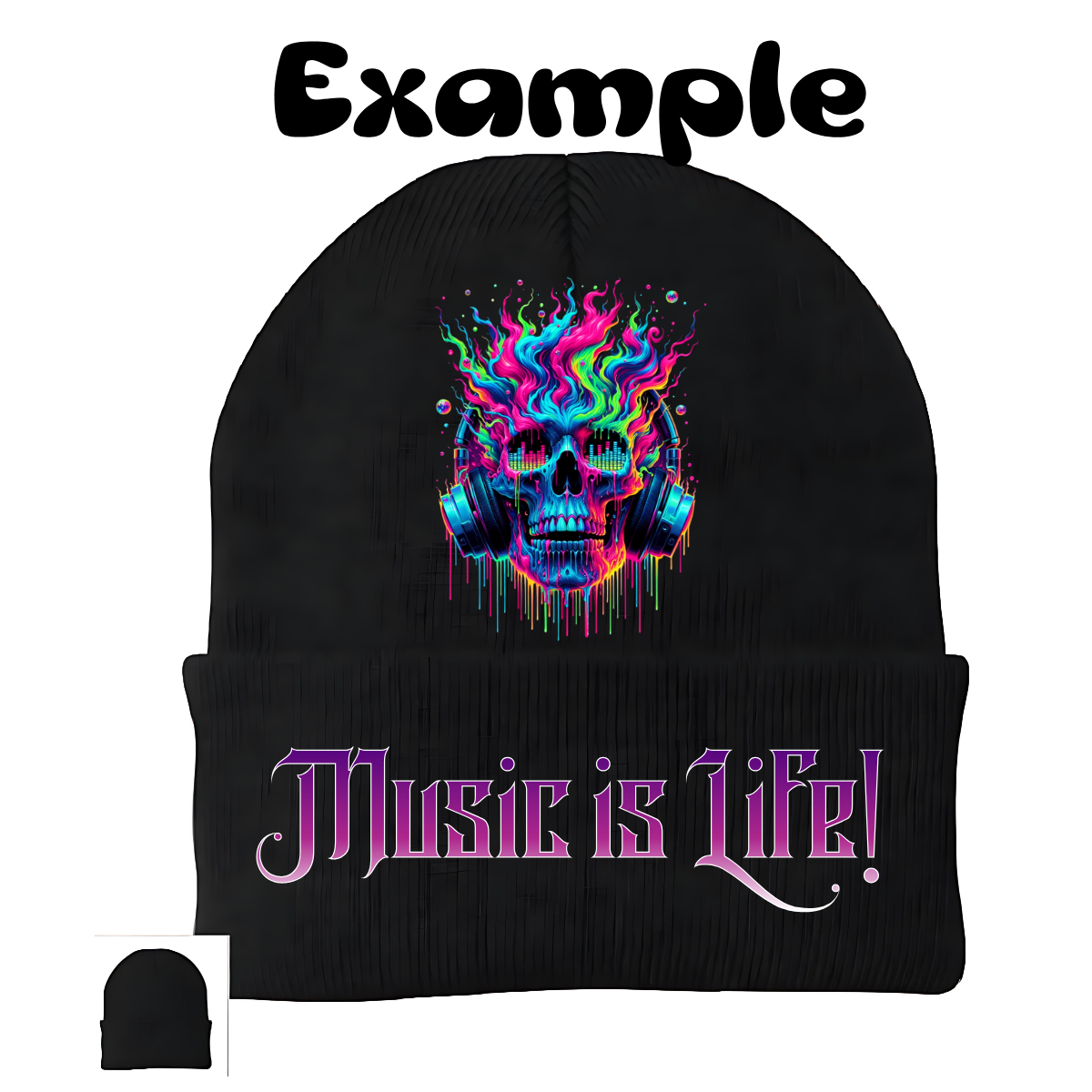 To get a custom or personalized beanie, you can either upload an image for us to print and press, or describe what you are looking for, and we will create something for you. If uploading an image, you can also specify what, if any, text that you want added to the hat. At this time, we only carry black beanies.
